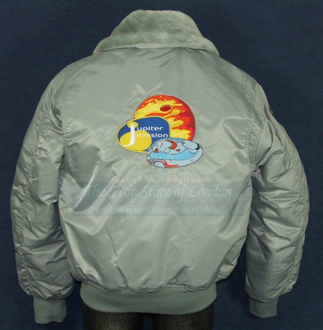 An original crew jacket from the set of the Matt LeBlanc and Heather Graham sci-fi movie Lost in Space. This grey / silver colored jacket has a faux fur collar and a colorful design embroidered on the back with the Jupiter Mission logo, a planet and the space craft. There is a blue and yellow emblem on one sleeve with "a.s.o.m.a.c" on it and "277-2211-10" embroidered underneath it. There is the name of a female crew member on the front with "Lost in Space, Model Unit, Shepperton, 1997" underneath. Size medium.