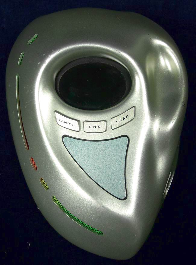 A DNA scanning gadget used by Heather Graham as Judy Robinson in the Matt LeBlanc and Gary Oldman sci-fi blockbuster Lost in Space. Heather uses this gadget in a scene that was cut from the film, but can be found in deleted scenes on the DVD. This prop is actually a miniature television inside a futuristic plastic casing, which has been sprayed silver and has 3 fake buttons on the front which have ‘Resolve, DNA and Scan' printed on them. The TV would have had a ‘video in' lead plugged in to it, so that the required image could be shown on screen. Measures 18cm x 13cm x 6cm