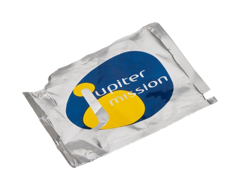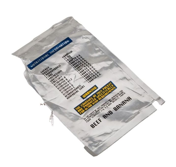 A foil pack used in the Lost in Space movie by Matt LeBlanc & Heather Graham. This foil covered prop was specially made for the production. It has the "Jupiter Mission" logo printed in color on the front, and nutritional info on the back. The packet is open and the remains of the banana and beef filling is still there.