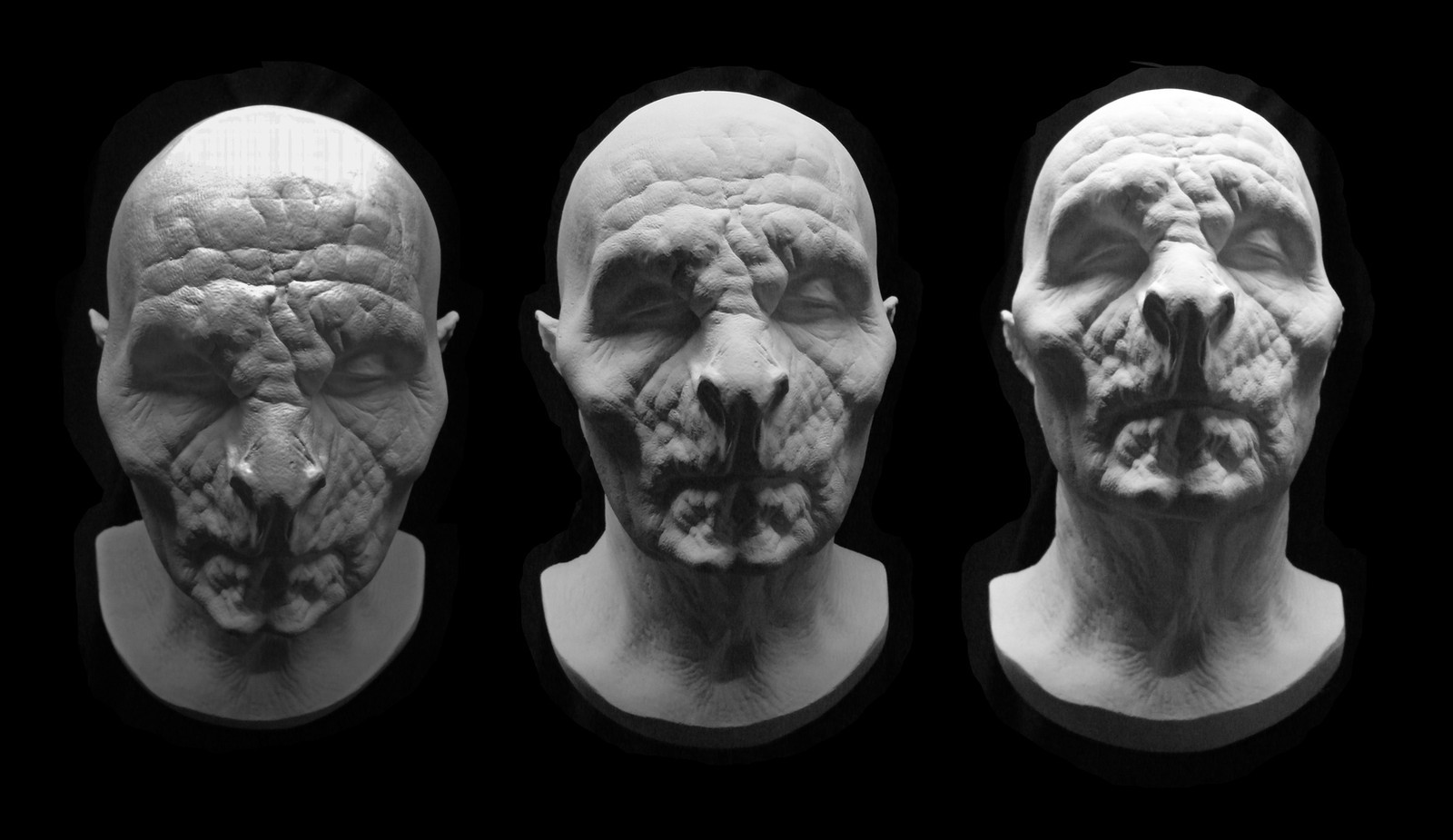 The second larger bat face casting is a copy of the actual make-up appliances used for the film and were worn by Gary Oldman in the movie. If you look closely at the two side by side comparison shots you can see that the eye lids are the same on both casts. The smaller cast is an actual copy of the one that was taken for his make-up to be designed on. A very beautiful art piece.