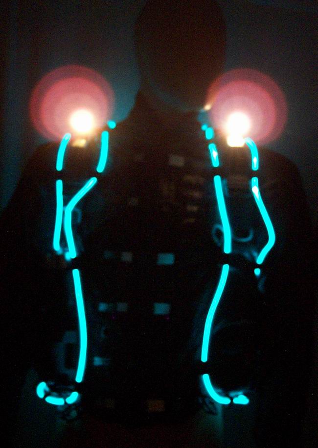 A tactical costume worn by Gary Oldman as Dr. Smith in the sci-fi movie Lost in Space. The costume consists of a rubberized vest that would have originally been a scuba divers which has been customized by the prop department. There is a large pipe on the back which connects to a rubber pack made to look like a fan. There are a series clear tubes running all around the edges of the jacket which light up neon blue when a switch is flicked on a power pack and there is a small working torch on each of the shoulders. Underneath the vest is a black jacket which fastens up the front with plastic clasps, has several pockets and is made from netting like material and strong waterproof material.