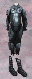 Jack Johnson "Will Robinson" mission duty uniform from Lost in Space. ( New Line, 1998 ) Complete costume consisting of a black neoprene jumpsuit adorned with silver and black foam body armor, with "Jupiter Mission" insignia at right chest and shoulder, and various attachments which are wired to illuminate. Also includes a pair of matching stylized space boots. Worn by Johnson as Will Robinson.