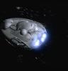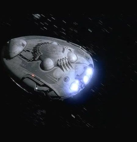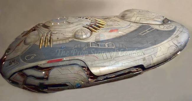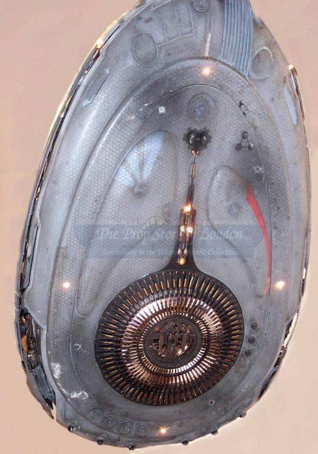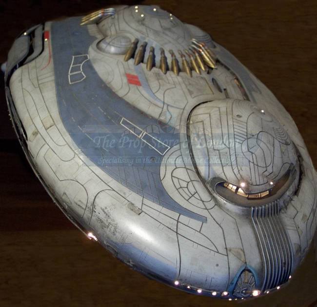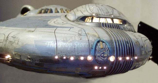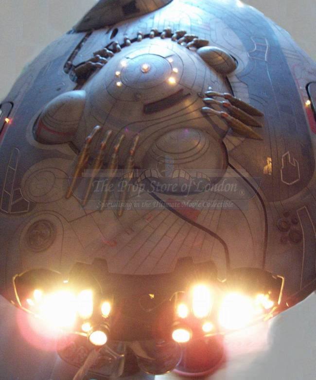 made model was used for the special effects shots in the movie. The ship is fabricated from fiberglass with various removable panels and lots of machined metal components. It is incredibly detailed piece of work that took nearly two months to build. The ship has a miniature crew inside on the bridge and it is fully wired with electronics with a multitude of lights situated all over the hull, on the underside and including the bridge and engines. The models lights operate on UK power supply. The ship comes complete with a purpose built wall mounting bracket that slots into any of the original shooting rig sockets concealed in the side, front and back of the ship. Measures approximately 75cm ( 30" ) long. A centerpiece of any collection.