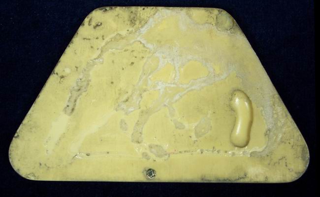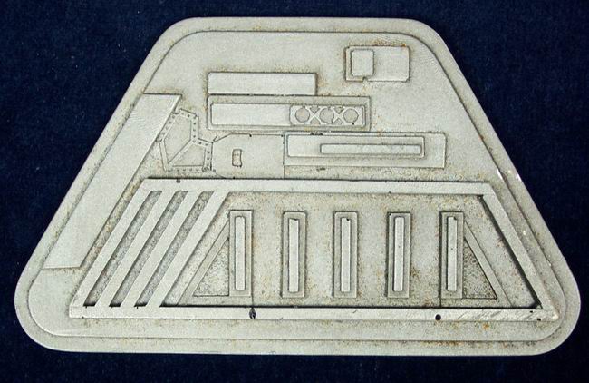 A panel from the model miniature Jupiter-2 used in the Matt LeBlanc and Gary Oldman movie Lost in Space. The small panel is made from resin with the front painted grey with detailing on it and the back unpainted with traces of glue where it was stuck onto the model ship. The flat panel measures 11cm x 7cm ( 4" x 2.5" ).