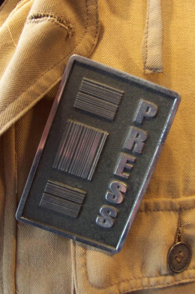 From the Lost in Space film of 1998. Featured here is a long beige coat worn by actor Matt LeBlanc. This jacket was used in the early Alpha Control press conference scene in which actor William Hurt explain the Jupiter-2 mission to programmers & the gathered news media. A resin prop press pass is attached to the garment.