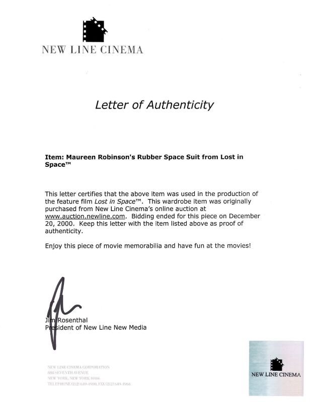version of Maureen Robinson, formally played by actress June Lockhart from the classic 1960's TV series. This heavy rubber suit was made and worn like an armor outfit. The life-support devices still light-up when activated. A great costume to own, and one of the more exciting items made and used for this movie.