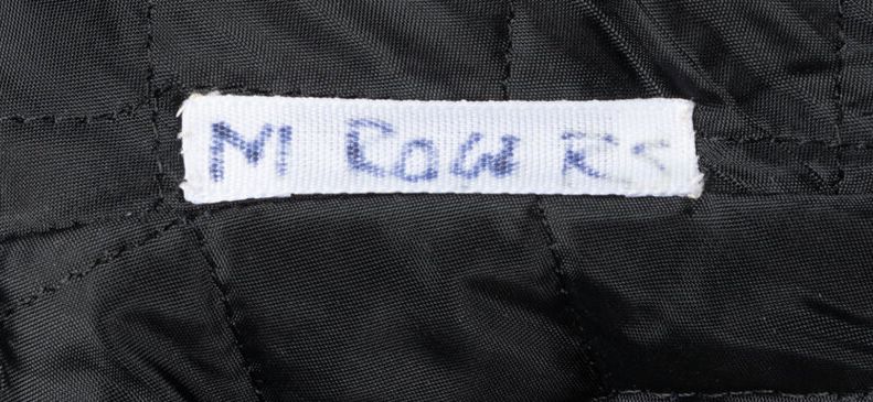 Mimi Rogers "Dr. Maureen Robinson" vest from Lost in Space. ( New Line, 1998 ) Original futuristic vest constructed of satiny dense pewter polyblend material with wide round tip collar, 2 diagonal slash and 2 hip flap pockets, with 3 blue painted metal plates affixed to left chest, 1 with "Jupiter Two", 1 with "Maureen Robinson", and 1 with engraved barcode, interior lined in quilted black fabric. Exhibiting minor production wear. In very good to fine condition. Provenance: New Line.