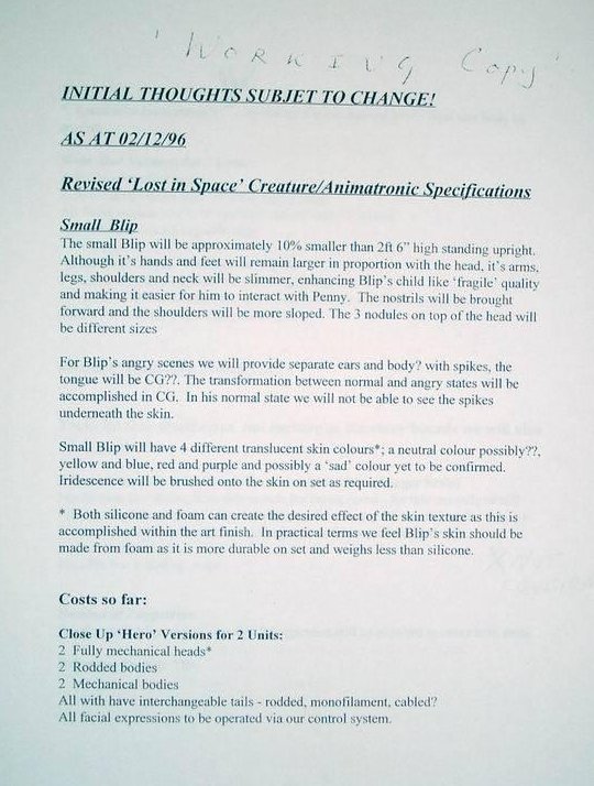 A set of production paperwork for the Gary Oldman and Heather Graham movie Lost in Space. The set consists of a complete script, 4 pages of Robot storyboards, a set storyboards with visual effects notes and a 9 page document entitled ‘Initial thoughts subject to change!'. All A4 size.