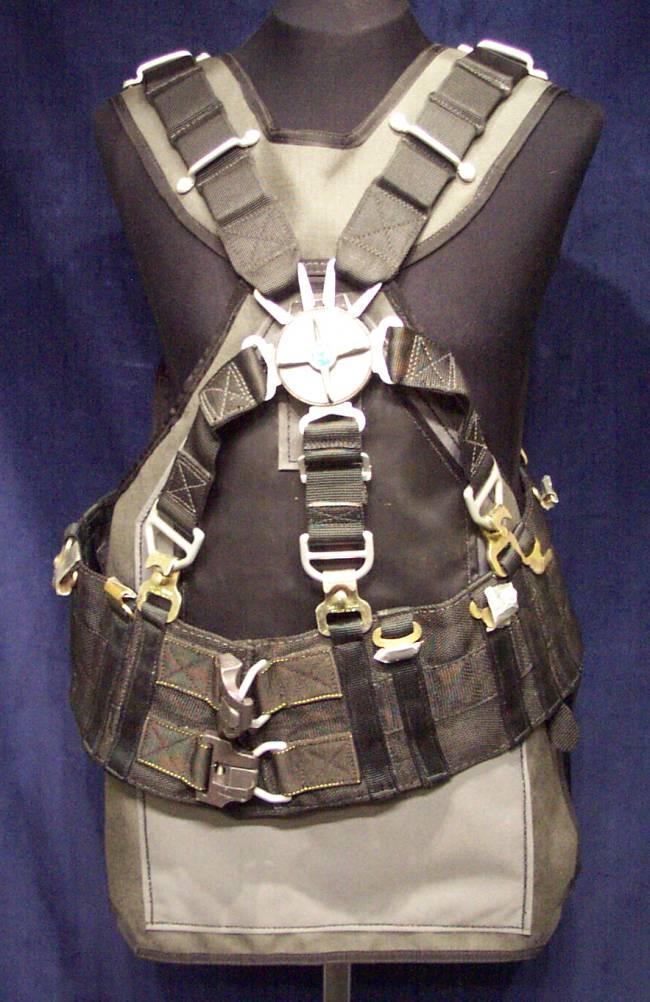 basically a harness with sturdy looking buckles and a wide belt with a moving metal concertina frame on the back. There is some webbing