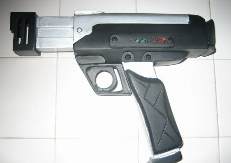 This is a replica of the pistol used in the Lost in Space movie. It is made from resin and has 3 leds on top ( One red, yellow,