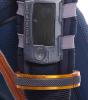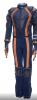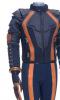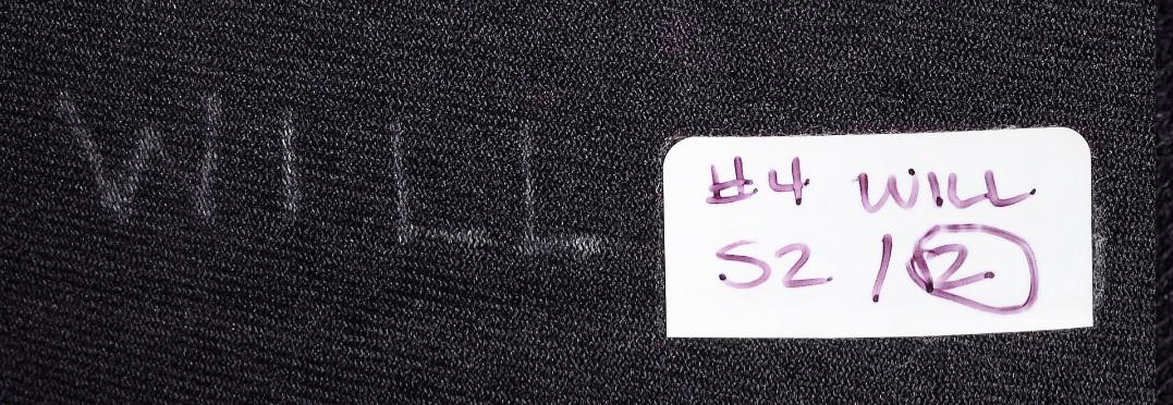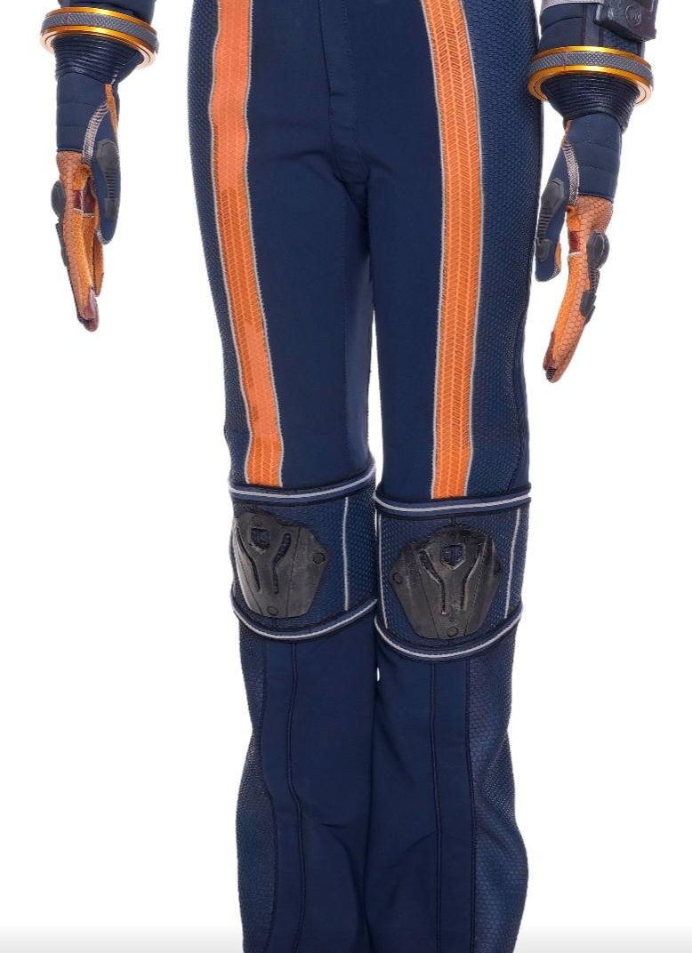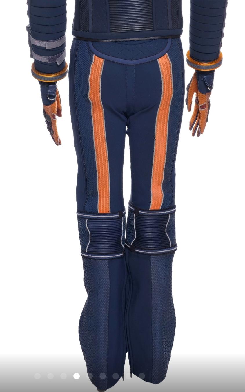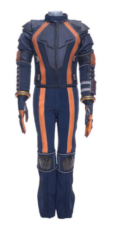 This costume consists of a blue and orange nylon neoprene jacket marked "Will" and labeled "#4 Will S2/2" matching blue and orange pants labeled "#4 Will S2/2" blue and orange nylon leather gloves; and a grey painted foam and plastic wrist communicator with grey elastic straps. The exhibits interior stains on the jacket and pants.