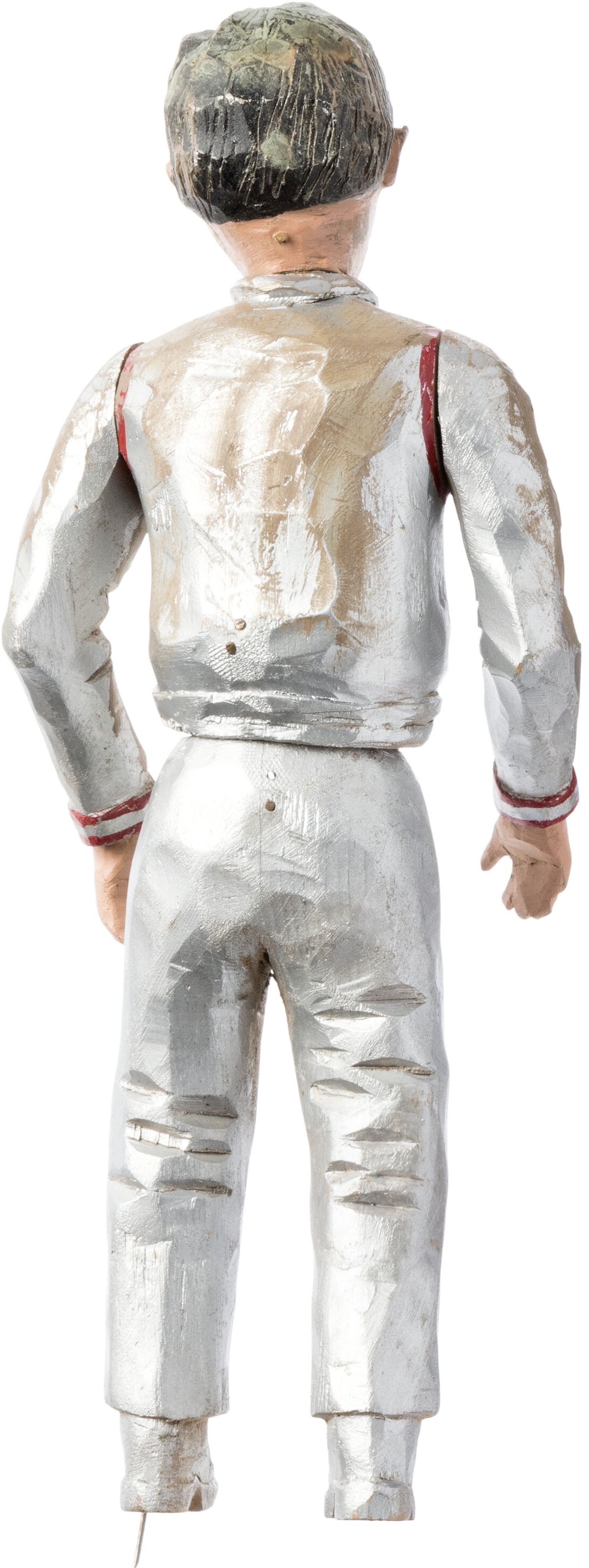 affixing the figure to a surface extending from the left foot. Painted in silver with red accents on the space suit, with the hands