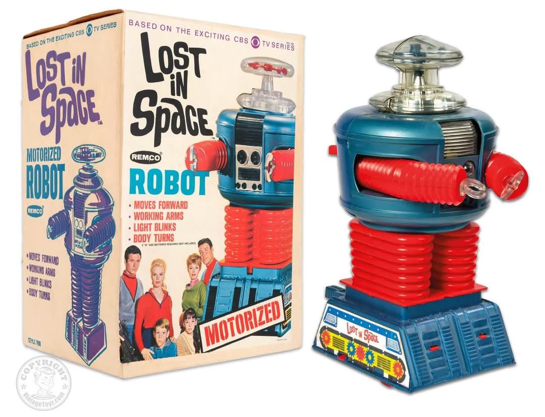 One of the more common color combinations on this 1966 Remco Robot. Remco also did two different blue color versions on this toy. A royal blue, and a greenish blue. I have one Remco Robot that the torso has two different blues on it. Very strange indeed, and quite rare to find. Boxes and instructions add much to the value of this high sought after collectible.