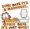 Garfield is an American comic strip created by Jim Davis. Originally published locally as Jon in 1976, then in nationwide syndication from 1978, it chronicles the life of the title character Garfield. Originally created with the intentions to "come up with a good, marketable character", Garfield has spawned merchandise earning $750 million to $1 billion annually.