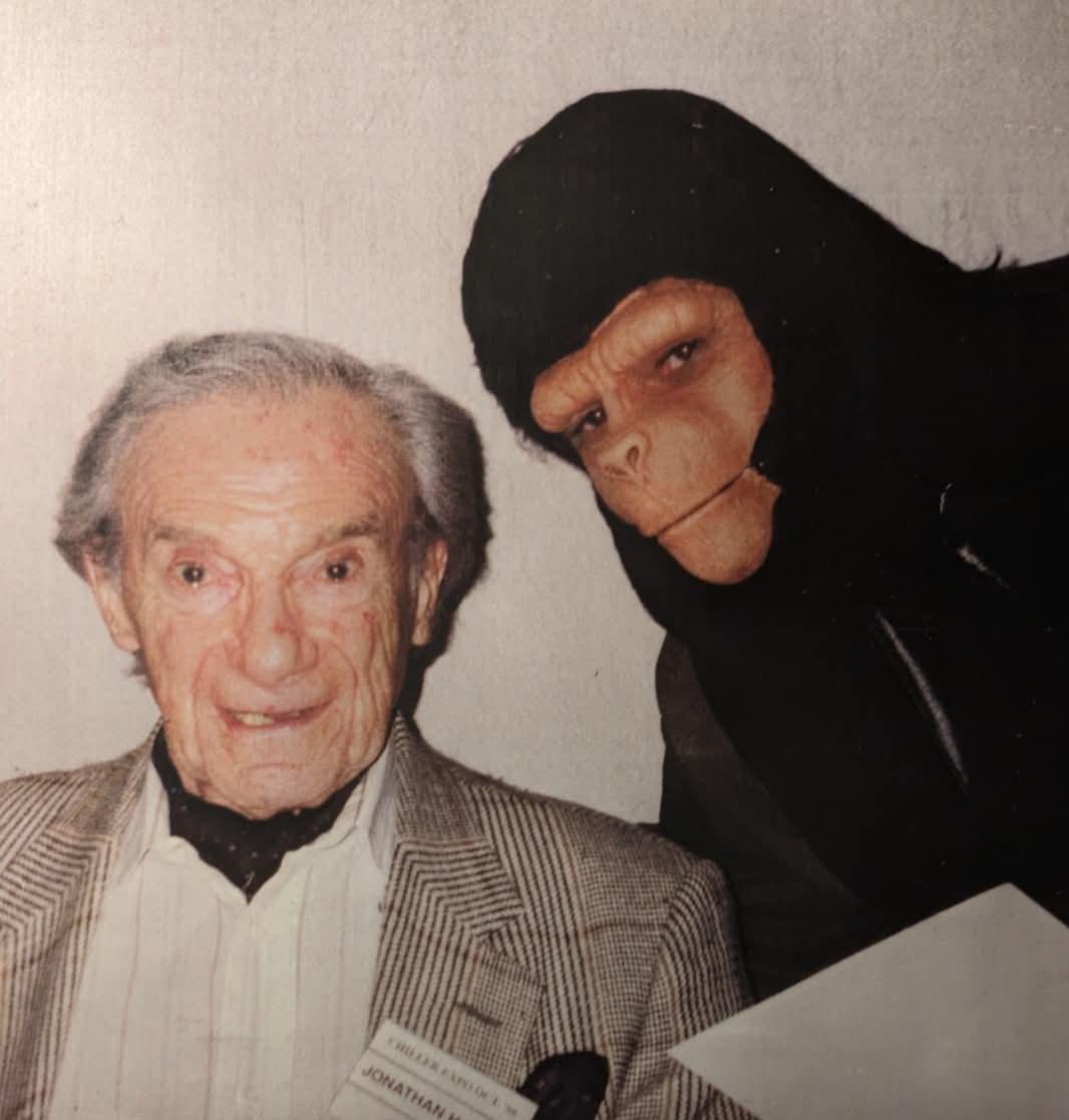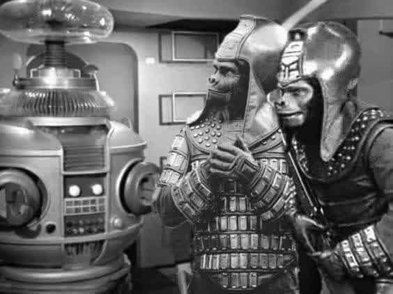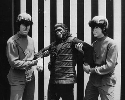 Planet of the Apes / Lost in Space CrossoverBy Bruce Fedow:Lost in Space meets Planet of the Apes! In a break between shots on each of their respective endeavors, two aliens from the "Hunter's Moon" episode of Lost in Space clown around with a gloveless gorilla from the first "Planet of the Apes" film!
