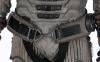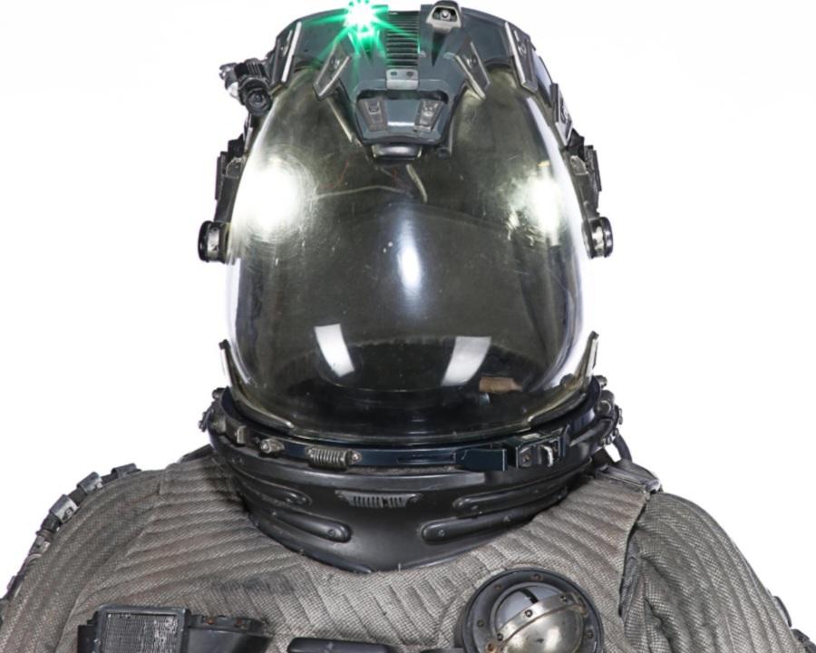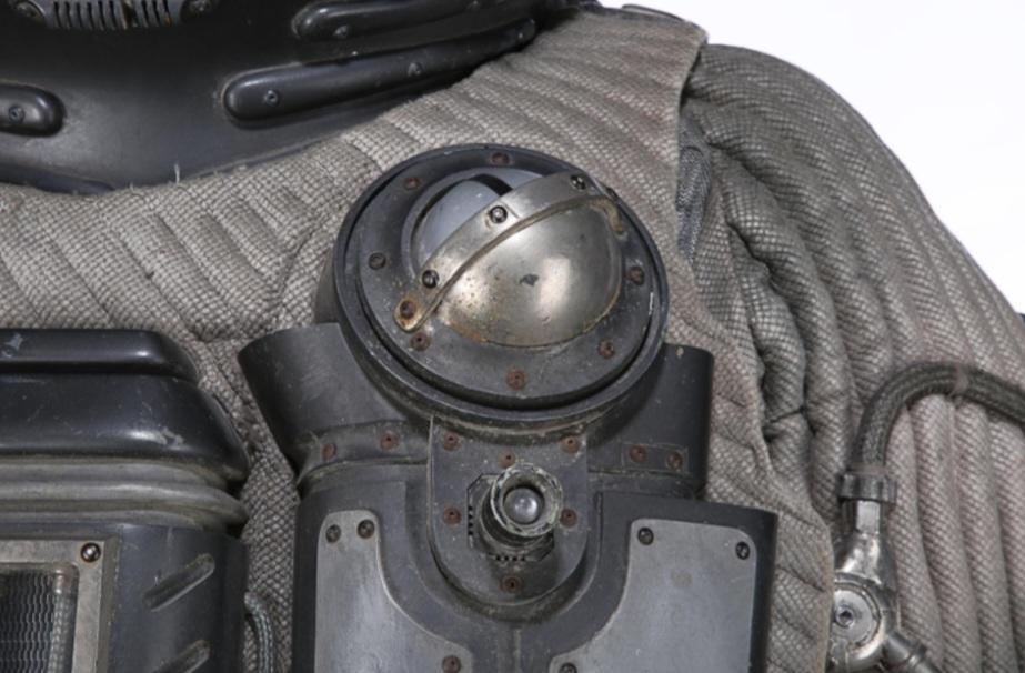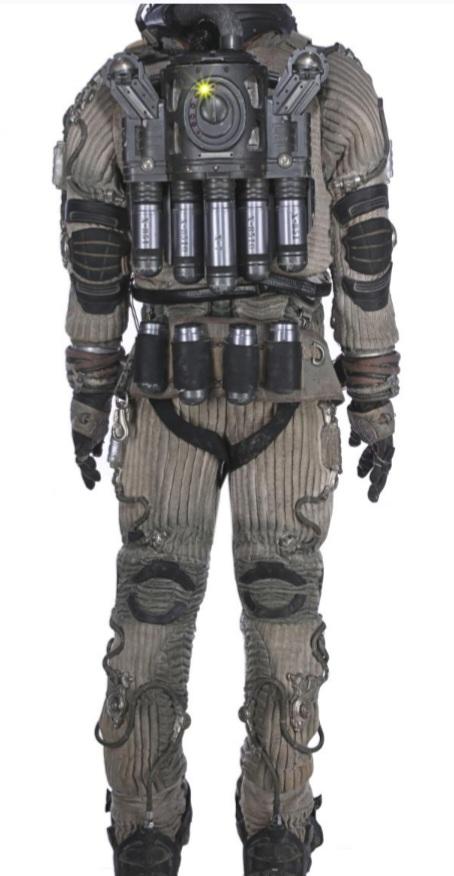 Powered by an elaborate battery system, electronic components are fitted within the helmet, chest and backpack, allowing them to illuminate with multiple LEDs. Demisting fans are housed inside the pack, linking to the helmet to supply the wearer with plenty of air and ventilation while performing on set. The electronics can be powered by a 12V power supply, which is not included in the lot. The costume was intentionally distressed for production, and the gloves remain in a fragile condition.