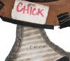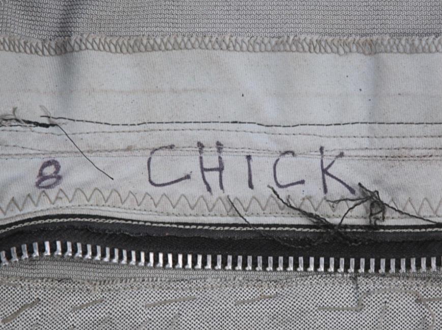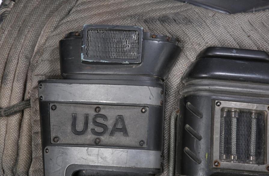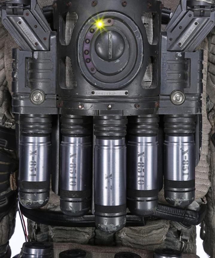 Most of the pieces have the character name "Chick" handwritten on the interior, and the suit features highly detailed metal, plastic and resin adornments. The backpack is marked "Ballast" and "Harry", suggesting that it belonged to Willis' character.