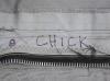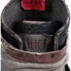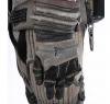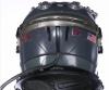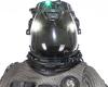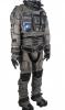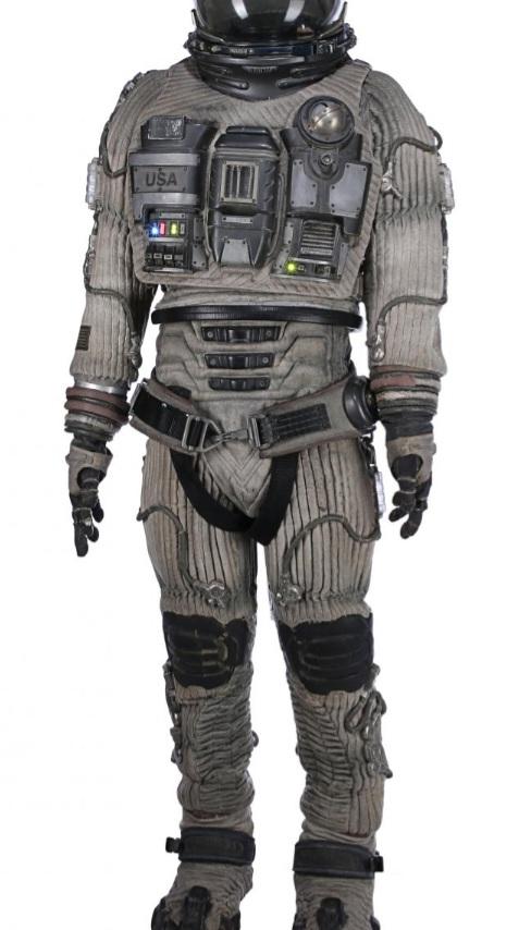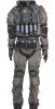 Constructed primarily from a heavy-weave, nylon-like material, the costume comprises a grey fiberglass helmet featuring a wide acrylic visor; a metal-and-resin collar; a front-and-back pack; a long-sleeved top and a pair of trousers that connect via a zip around the waist; a pair of gloves with metal locking rings; a utility belt; and a pair of modified Vans boots covered in dress-up components ( Labelled "Chick, Size 10" ).