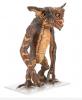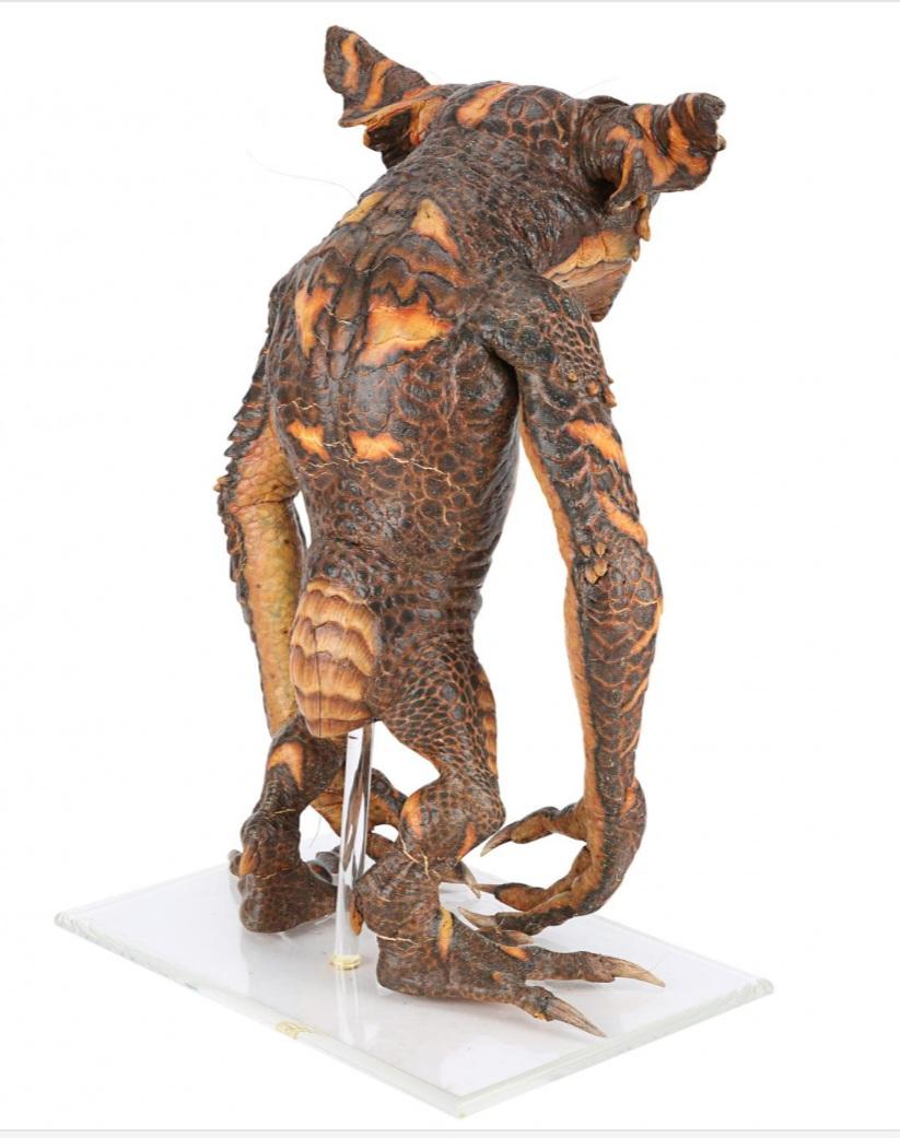 This gremlin's head is made of foam latex, while its body is made of latex and polyfoam, with a metal skeleton. It is painted predominantly brown and orange, with red resin eyes. Lengths of fishing wire and string protrude from several parts of the body, allowing it to be puppeteer. The gremlin has some wear from production use and age, most notably cracking to the fragile latex skin in places, while the tip of its right ear has come away. The gremlin is displayed on a custom-made, clear acrylic stand. Dimensions ( Displayed ): 42 cm x 46 cm x 67 cm ( 16" x 18" x 26" ).