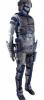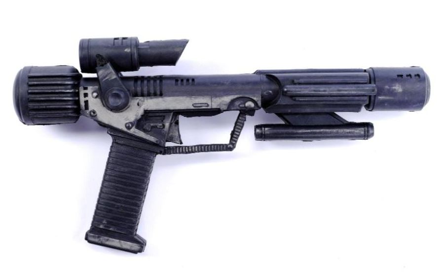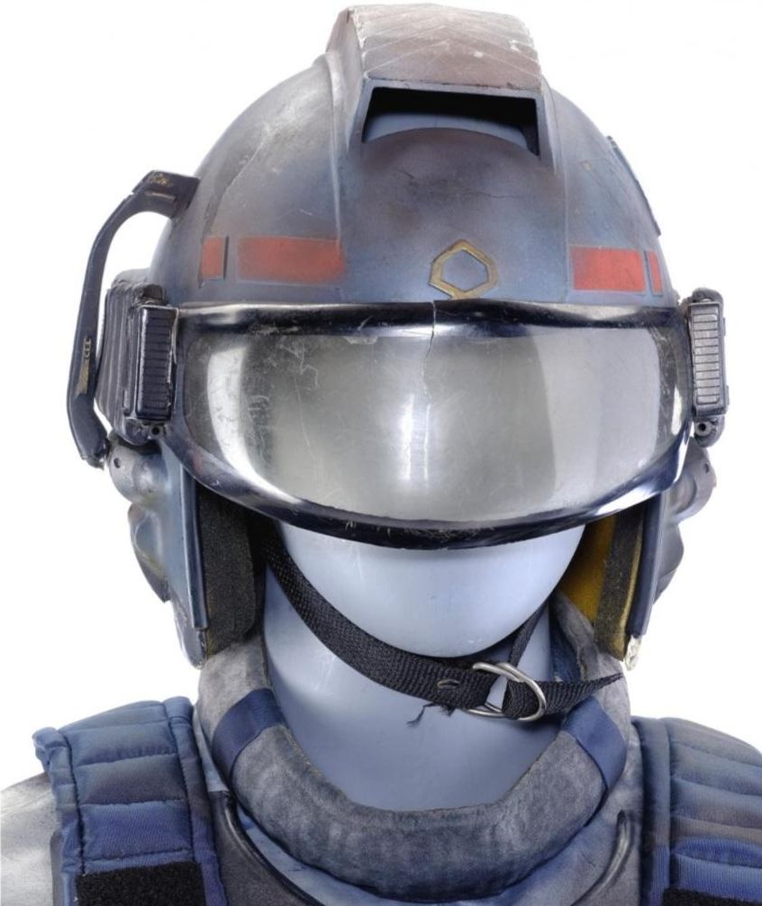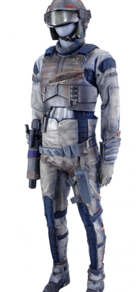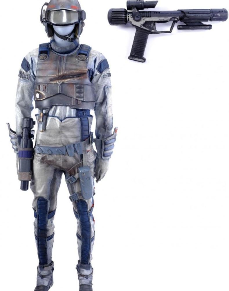 This costume consists of a grey plastic helmet with a transparent visor accent; a grey plastic chest armor piece with navy padded nylon straps; a grey and navy cotton, suede and leatherette jacket affixed with a unitard detail at the waist; matching trousers; a pair of grey suede gloves with grey and blue plastic accents at the wrists; a grey nylon belt with plastic details; a pair of grey leather and rubber boots; and a black rubber molded blaster. The costume exhibits signs of wear from age and use throughout, including discolored paint and some fraying.