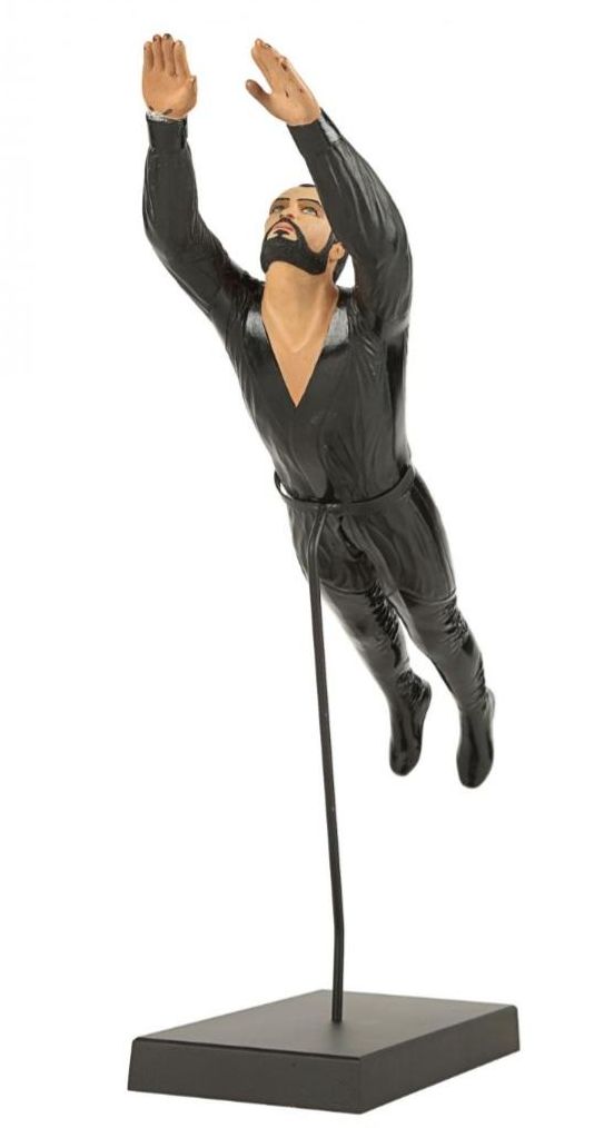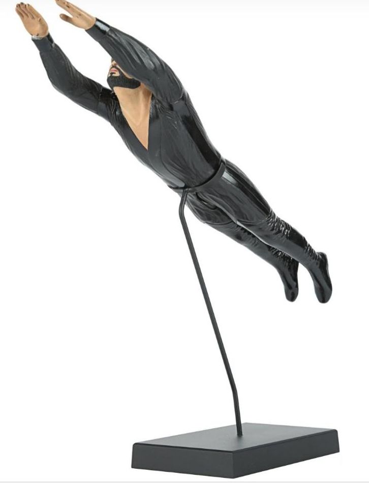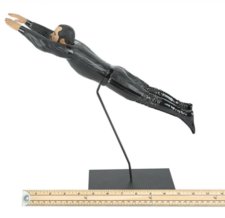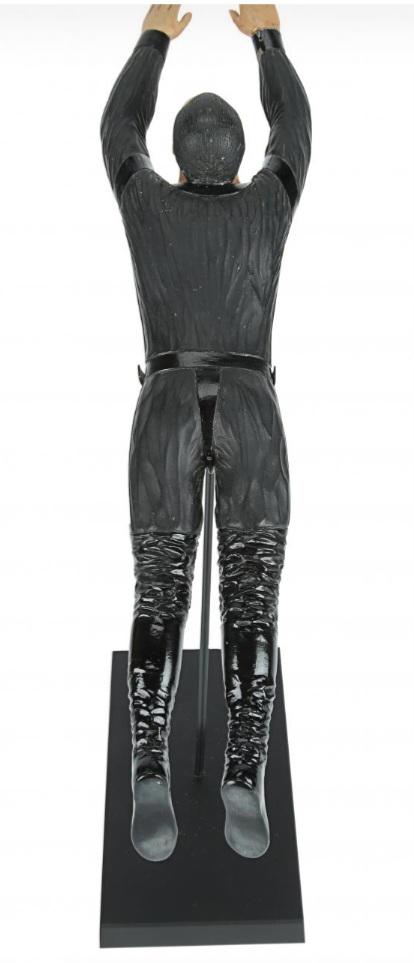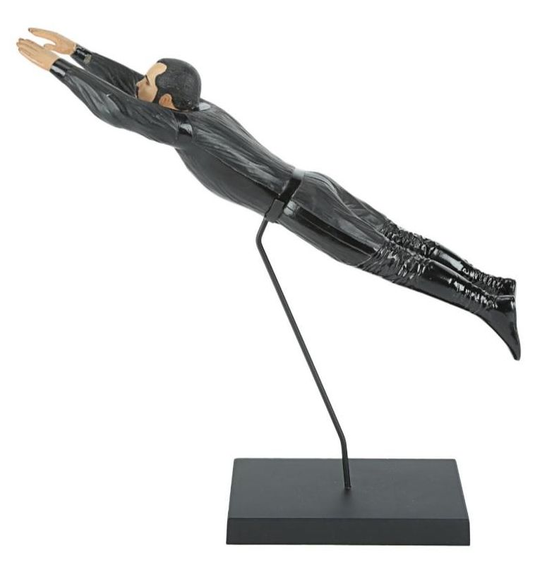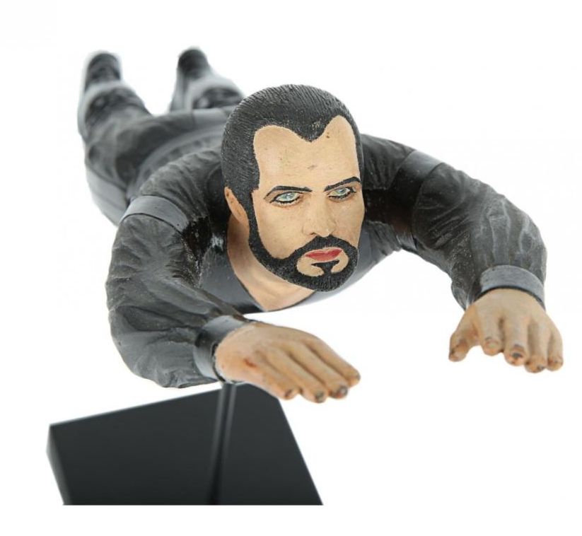 Created by renowned visual effects supervisor Derek Meddings, this miniature is a cast resin model of Zod in his black V-necked costume, with his arms stretched out in front of him. The model's head features a highly detailed painted face, complete with slicked-back dark hair. The model comes on a custom-built stand, which gives the illusion of flight. There are some minor signs of paint wear and scuffing, and a small chip is present on the left arm. Dimensions ( Displayed ): 32 cm x 10 cm x 34.5 cm ( 12" x 4" x 13" ).
