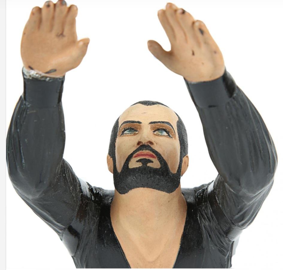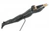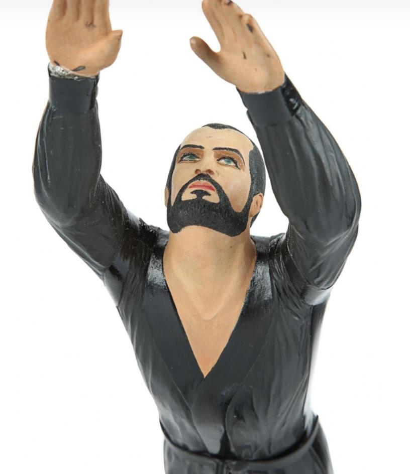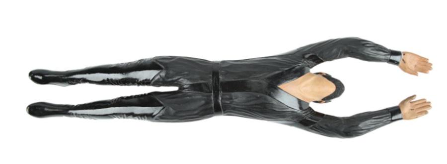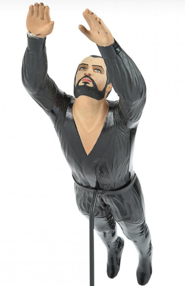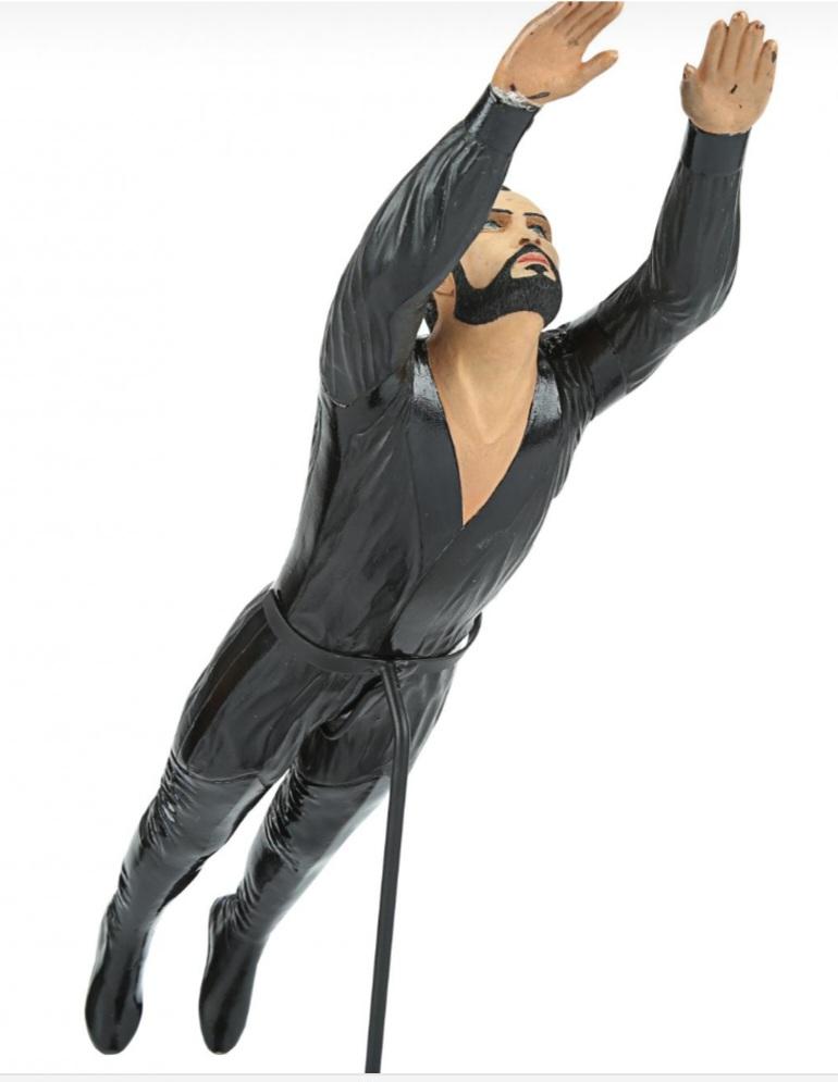Created by renowned visual effects supervisor Derek Meddings, this miniature is a cast resin model of Zod in his black V-necked costume, with his arms stretched out in front of him. The model's head features a highly detailed painted face, complete with slicked-back dark hair. The model comes on a custom-built stand, which gives the illusion of flight. There are some minor signs of paint wear and scuffing, and a small chip is present on the left arm. Dimensions ( Displayed ): 32 cm x 10 cm x 34.5 cm ( 12" x 4" x 13" ).
