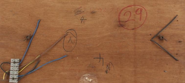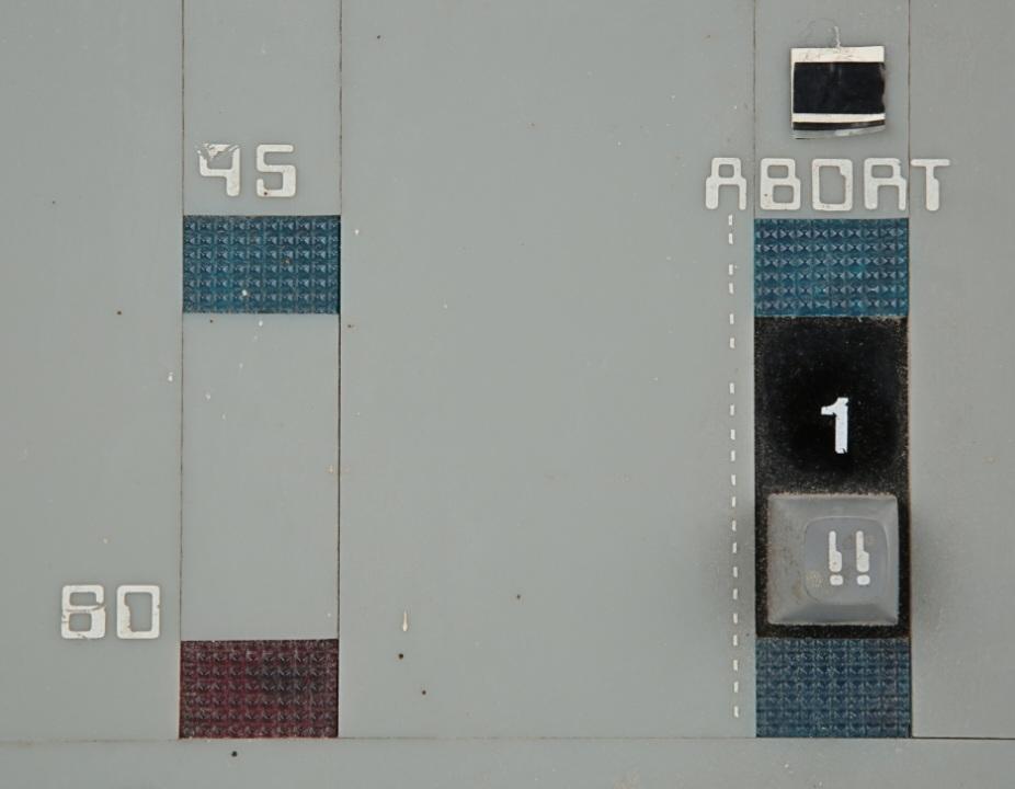 Adhered to a wooden base, the light grey acrylic panel is decorated with several buttons, white-painted numbers and decals. There are several small, blue-and-red-colored textured plastic sections, which once flashed on and off. The panel's electronics remain untested. Three of the buttons along the top edge have been replaced and adhered with Blu-Tack. Dimensions: 29.5 cm x 59.5 cm x 10 cm ( 11" x 23" x 4" ).