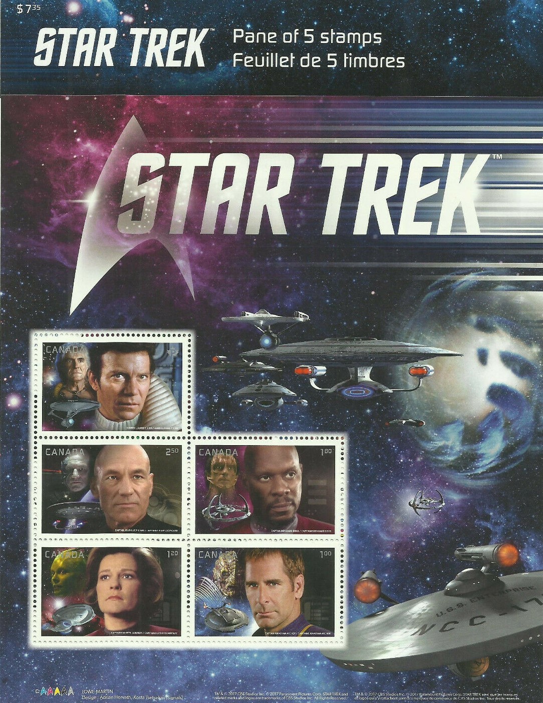The Enterprise inside the outline of the Vulcan salute ( Spocks iconic hand gesture ) against a blue background. The words Space... The Final Frontier, from Captain Kirks famous voice over appears beneath the stamps against a background of stars. The stamp images were created by the design firm Heads of State of Philadelphia, PA, under the art direction of Antonio Alcala of Alexandria, VA.