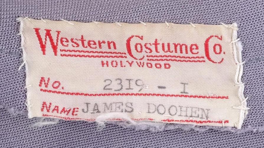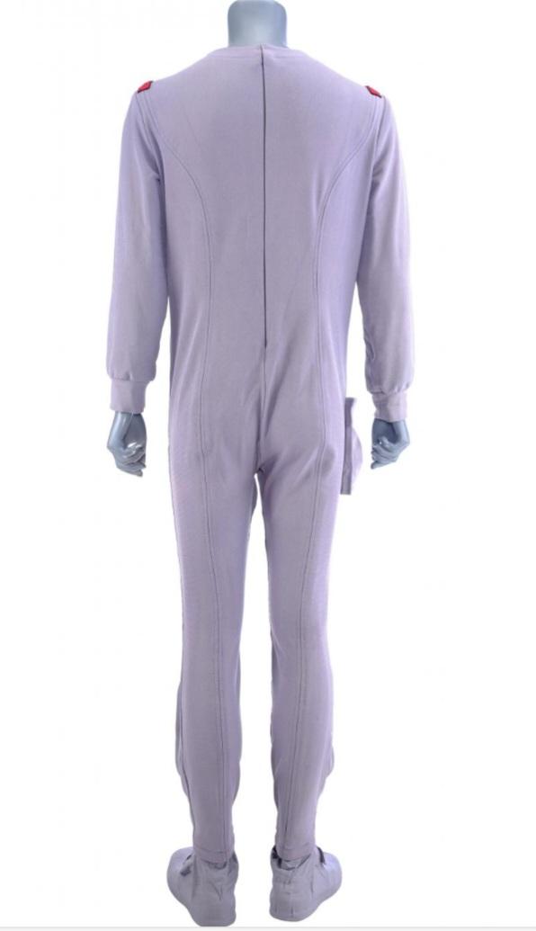 This grey polyester blend Starfleet Class D uniform consists of a full-length grey jumpsuit with a functioning pocket and a Starfleet insignia emblem on the chest. It features a fastening strip and clasp size adjustment on the ankle cuff, and a sewn in Western Costume Co. label marked "James Doohen" on the interior. Also included is a black, brown, and silver wooden replica bio monitor, two replica rank braids on the shoulders, and a pair of replica grey shoes added to complete the costume. The costume exhibits minor signs of wear from age and use throughout.