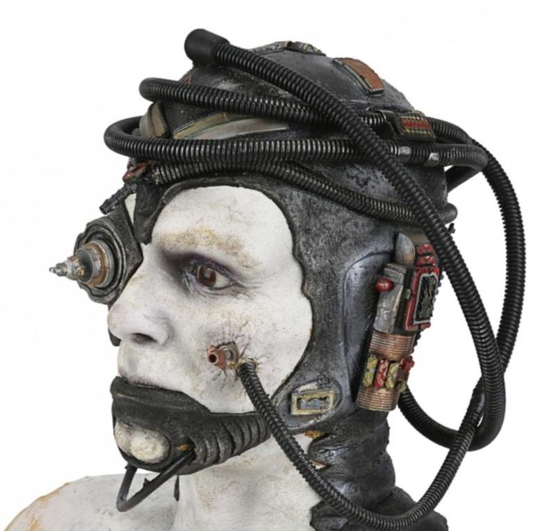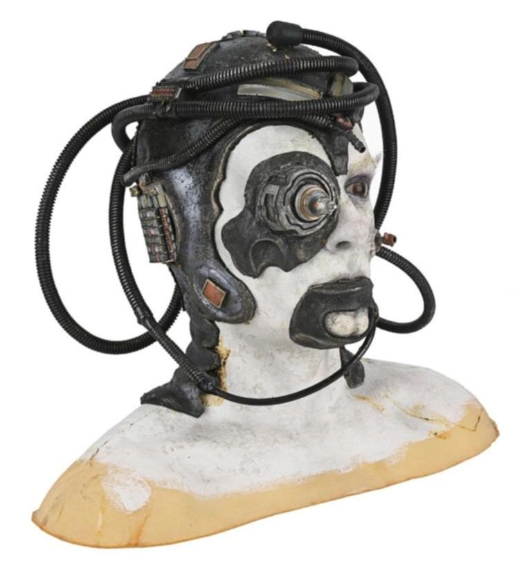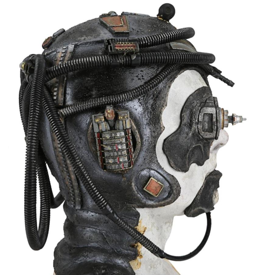 A bust modelled on the Borg, from the sci-fi television series Star Trek: The Next Generation. The Borg were recurring antagonists on the show, cybernetic organisms linked to a hive mind "The Collective" who sought to forcibly assimilate other species. This bust was produced from the original production molds for the exhibition Star Trek: Federation Science, which toured around the United States and Europe during the 1990s and early 2000s.
