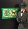 atop a smoking create and a Green Hornet dart in hand, Kato stands over a knife stuck in the crate, holding a note that says