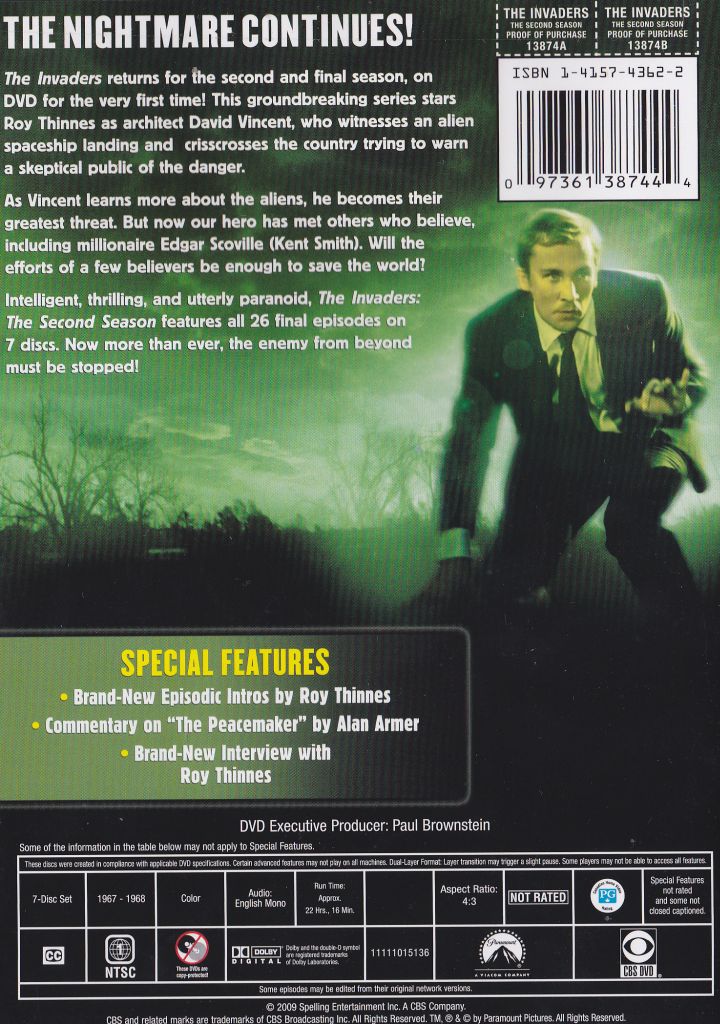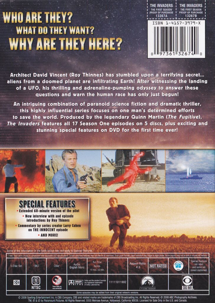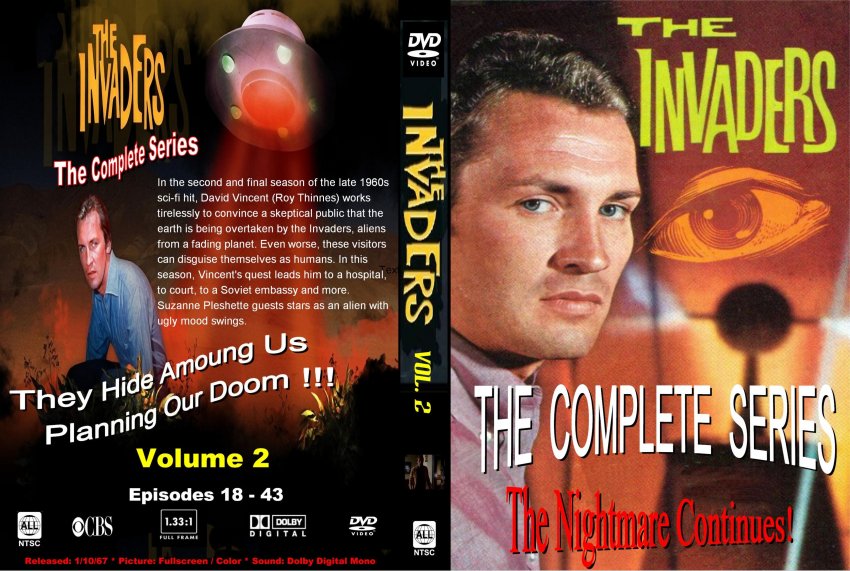 This is the complete collection of the 1967-68 television series, "The Invaders". Season 1 is a four disc set. Season 2 is a six disc set. Disc's include color artwork and come in Paper / Cello sleeves. Included is an episode listing for each DVD.