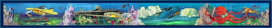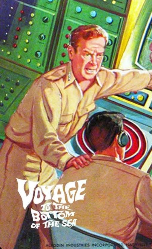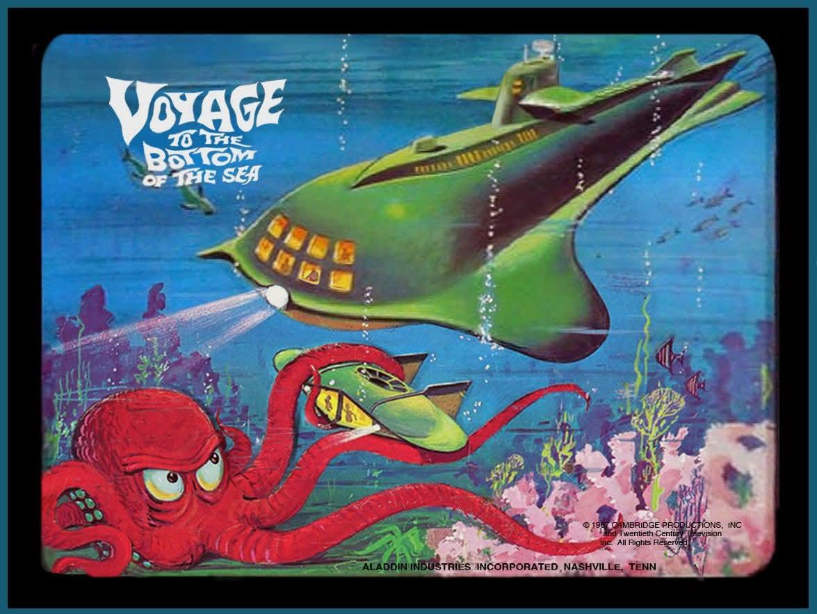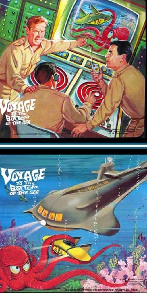 Issued by Aladdin Industries in 1967. A black metal box with the Seaview and Flying Sub being attacked on one side. The other side pictures, Nelson & Crane observing a sea monster. The box also includes a thermos bottle with artwork images.Value: $400.