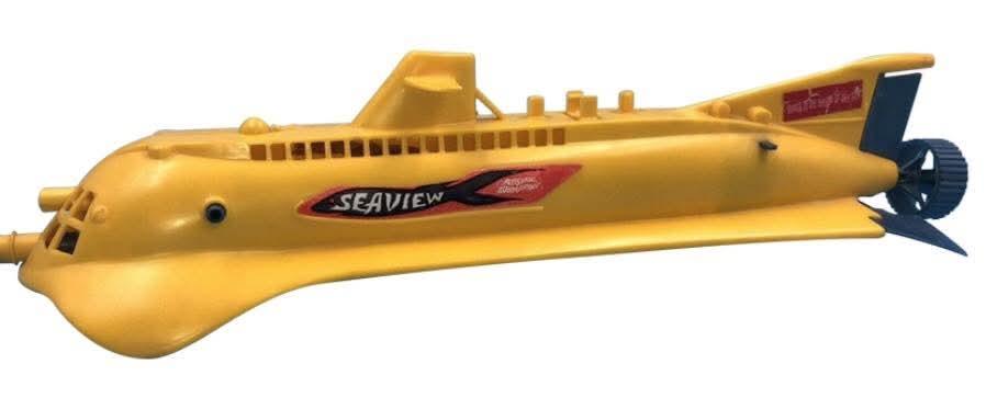 A complete set of the Remco Seaview toy sold at Sears in 1965. Made of yellow and blue plastic, measures 18". Includes bottom wheels, rubber band that can be wound up to turn propeller, with moveable parts and shooting torpedoes.Value: $500.